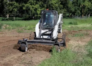 The Versatile, Erskine Soil Conditioner (Harley Rake) Attachment rakes up stones and debris to either side or straight ahead for easy pickup. The aggressive teeth on the large-diameter rotor pulverize soil like an ordinary tiller, with the benefit of faster ground speed. The counter-rotating rotor moves soil ahead of it as it tills, filling in low spots and chewing off high spots. It creates perfect seedbeds and windrows. The Utility Soil Conditioner separates rocks, tears up sod, and pulverizes dirt clods. We rake and till deeper – as deep as 4″.